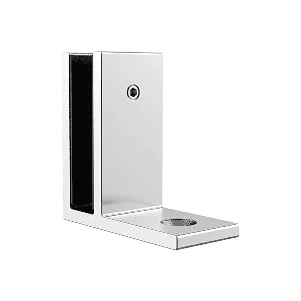 Attache murale en acier inoxydable permettant la fixation directe d’un panneau de verre à un mur. Solution propre et élégante pour une installation stable et discrète.